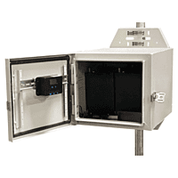 The outdoor enclosures are powder coated steel or aluminum. They are hinged and gasket sealed with a locking closure that accepts a common padlock for security. They have four cable gland ports for CAT5/6 cable, antenna cables/connectors or other cabling. Included is a thermostatically controlled fan assembly which turns on automatically when the temperature exceeds 45°C.