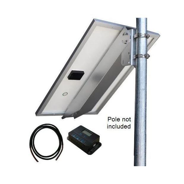 Complete solar kit including panel, pole/wall mount, outdoor 12AWG cable, and battery charge controller Pole or wall mount accommodates 2" to 6" diameter poles Quick tilt adjustment (15° to 65°) Certified for up to 110MPH winds